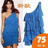 hm浪漫甜美單肩/斜肩多層次合葉邊寶藍色連衣裙